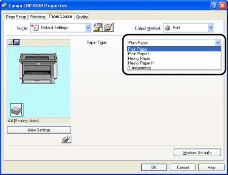 When [Envelope C5], [Envelope COM10], [Envelope DL], [Envelope Monarch], [Index Card], or a custom paper size is selected for [Output Size] in the [Page Setup] sheet, [Paper Type] is grayed out and cannot be selected.