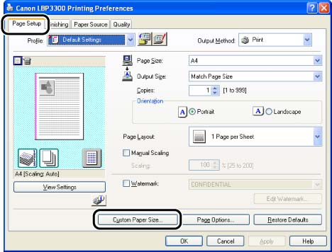 1. Display the [Page Setup] sheet, then click [Custom Paper Size].