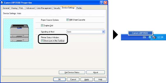 - Display the [Printer Properties] dialog box and display the [Configuration]/[Device Settings] sheet, and then select the [Show Icon in the Taskbar] check box. The icon for the Printer Status Window is displayed in the Windows taskbar. Click the icon, then click [Canon LBP3500] to run it.