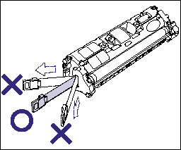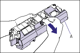 a. Do not hold or touch the developing roller (A), as this may result in deterioration in print quality. Do not jolt the toner cartridge memory (B) or bring it near a magnetic field, as this may result in damage to the cartridge.
