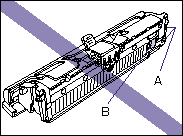 b. Be careful not to hold or touch sensitive areas such as the sensor (A) or electrical contacts (B), as this may damage the toner cartridge or printer.