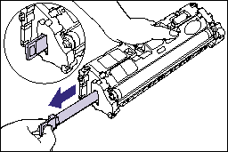 b. Pull out the sealing tape completely from the toner cartridge. If any tape remains in the toner cartridge, this may result in poor print quality.