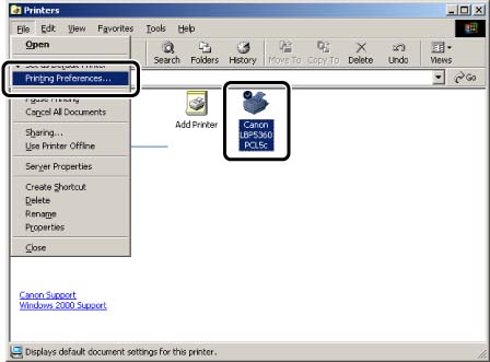 For Windows 2000: From the [Start] menu, select [Settings] -> [Printers].
