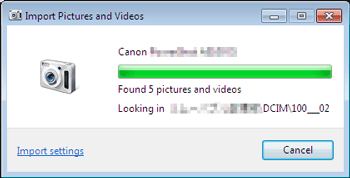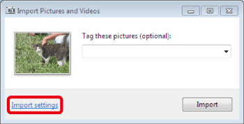 If you want to check the destination where the images will be saved, or the folder name that will be created, click [Import settings]. If you don't need to check these things, proceed to Step 9. (The images are saved in [Pictures] or [My Pictures] by default. The folder name indicates the date the images were imported, such as [2007-10-15])