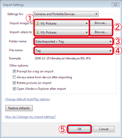 [OK].If you want to create folders in [Pictures] by the dates that the images are imported, leave the default settings as they are, or make the setting like the ones shown on this screen.