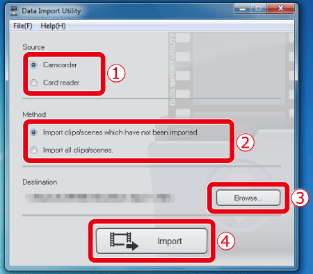 - The following explanations use Windows 7 and Data Import Utility Ver. 2.0.0 in their examples. Depending on the operating system on your computer or the version of the application that came with your camcorder, the screens shown and operations required may differ from those shown here.