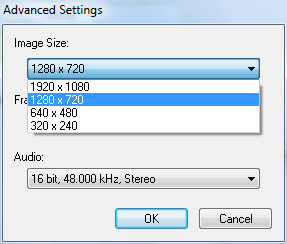 If you select [Specify a save image type] and click [Advanced Settings], you will be able to set the [Image Size], [Frame Rate], and [Audio].