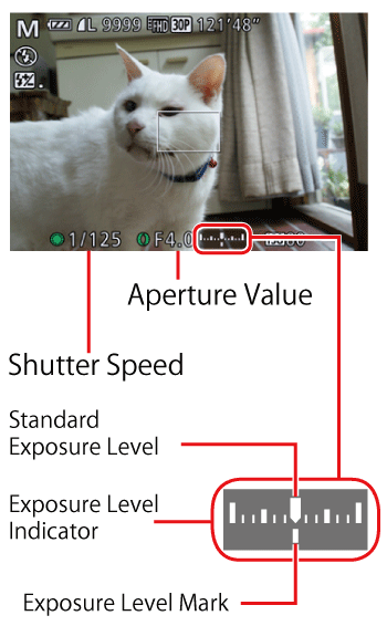 - An exposure level mark based on your specified value is shown on the exposure level indicator for comparison to the standard exposure level.