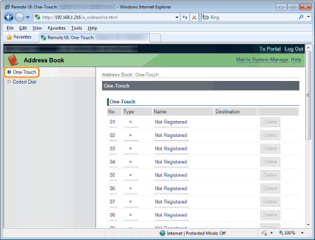 To edit the registered one-touch key(1) Click [No.], [Type] or [Name].