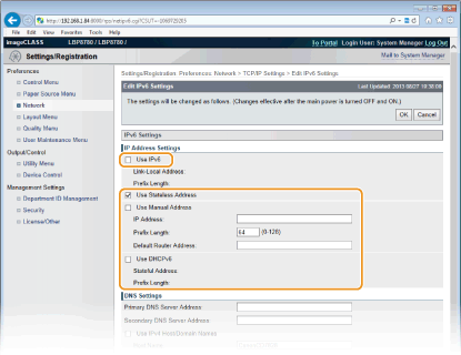 - When using the IPv6 in the machine, select the check box. When not using, clear the check box. You can also specify whether to use an IPv6 address from the operation panel.