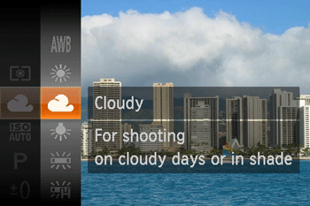 Cloudy | For shooting in cloudy conditions, in the shade, or at twilight. |