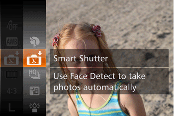 | Auto Shooting after Smile Detection | The camera shoots automatically after detecting a smile, even without you pressing the shutter button. | 1.After you choose , [ ]the camera enters shooting standby mode, and [Smile Detection on] is displayed.2. Aim the camera at a person. - Each time the camera detects a smile, it will shoot after the lamp lights up. - To pause smile detection, press the < > button. Press the < > button again to resume detection. |