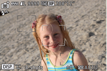 | Auto Shooting after another Person Enters the Shooting Area | The camera will shoot about two seconds after detecting that the face of another person (such as the photographer) has entered the shooting area. This is useful when including yourself in group photos or similar shots. | 1. Compose the shot and press the shutter button halfway. Make sure a green frame is displayed around the face you focus on and white frames around other faces. 2. Press the shutter button all the way down. - The camera now enters shooting standby mode, and [Look straight at camera to start count down] is displayed. - The lamp blinks and the self-timer sound is played. 3. Join the subjects in the shooting area and look at the camera. - After the camera detects a new face, the lamp blinking and self-timer sound will speed up. (When the flash fires, the lamp will remain lit.) About two seconds later, the camera will shoot. |
