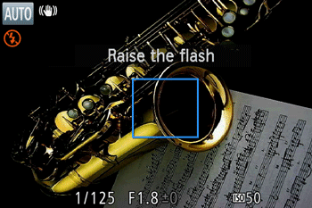 When shooting in [AUTO] mode in low-light conditions, [Raise the flash] may be displayed on the camera’s screen. In this case, please move the <