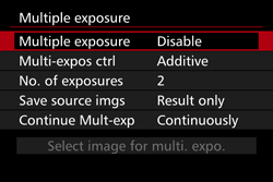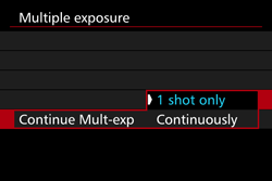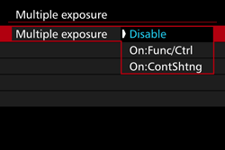- With [Continuously], multiple-exposure shooting continues until the setting in steps 4- 5 is set to [Disable].
