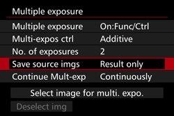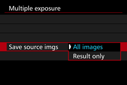 If [Save source imgs: All images] is set, all of the single exposures and the merged multipleexposure image will be saved before exiting. If [Save source imgs: Result only] is set, only the multiple-exposure image merged so far will be saved before exiting. |