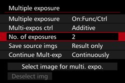 - If [On:Func/Ctrl] and [Additive] are both set, the image displayed during shooting may look noisy. However, when you finish shooting the set number of exposures, noise reduction will be applied and the final multiple-exposure image will be less noisy.