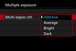 | Additive | The exposure of each single exposure is added cumulatively. Based on the [No. of exposures], set a negative exposure compensation. Refer to the basic guide below to set a negative exposure compensation. Exposure Compensation Setting Guide for Multiple Exposures Two exposures: -1 stop, three exposures: -1.5 stop, four exposures: -2 stops |