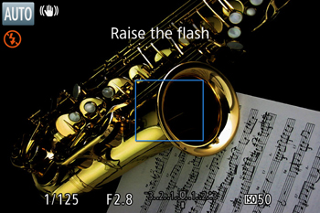 When shooting in [AUTO] mode in low-light conditions, [Raise the flash] may be displayed on the camera’s screen. In this case, please move the [