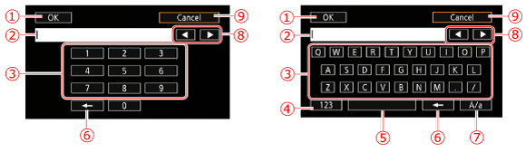 When you need to enter text for various settings, touch the text field and a virtual keyboard will appear on the screen. You must use the touch screen to operate the virtual keyboard. The illustrations below explain the various keys you can use.