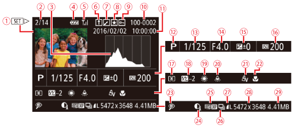 ![]() | Shutter speed | ![]() | Still images: Resolution Movies: Playback time |
