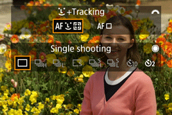 (face)+Tracking ", the camera detects and focuses on human faces. If a face moves, the AF point [