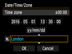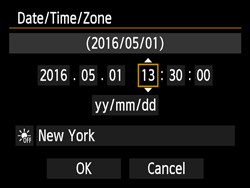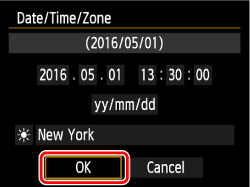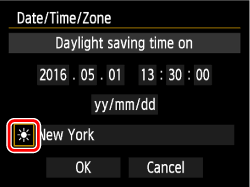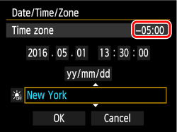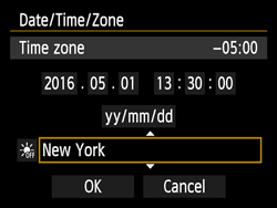 1. When you turn on the power for the first time, the date/time/zone setting screen will appear. Follow the steps below to set the time zone first. Note that the date/time appended to recorded images will be based on this date/time setting. Be sure to set the correct date/time.