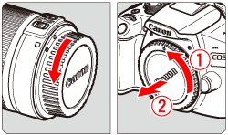 2-1. Remove the rear lens cap and the body cap by turning them as shown by the arrows.