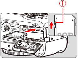 As shown by the illustration, face the card's label side toward the back of the camera and insert it until it clicks in place.