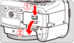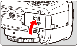 After opening the card slot/battery compartment cover, be careful not to forcefully swing it back further. Otherwise, the hinge may break.