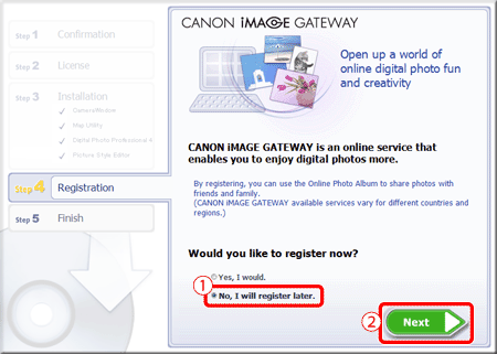 : [Next] has been clicked. (To register in CANON iMAGE GATEWAY, select [Yes, I would] and complete the registration procedure.)