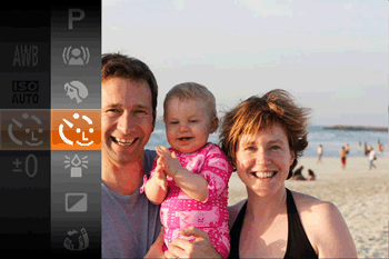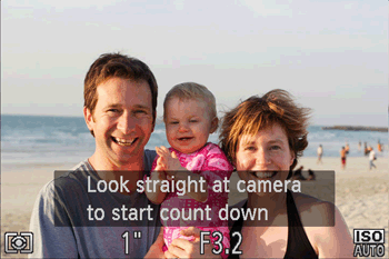 The camera will shoot about two seconds after detecting that the face of another person (such as the photographer) has entered the shooting area. This is useful when including yourself in group photos or similar shots.