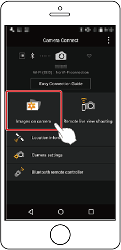 7.Touch [Images on camera] in Camera Connect.- The camera will automatically switch to Wi-Fi if you choose [Images on camera] in Camera Connect.