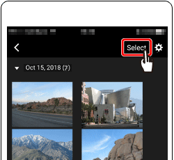 16. Use the smartphone to import images from the camera to the smartphone. - Touch [Select] in the upper right of the screen.